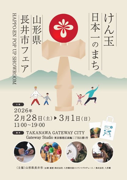 今回のイベントタイトルは、-HAPPO-EN POP UP SHOWROOM-『けん玉日本一のまち 山形県長井市フェア』!